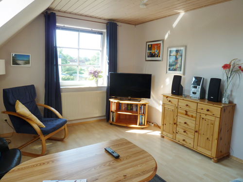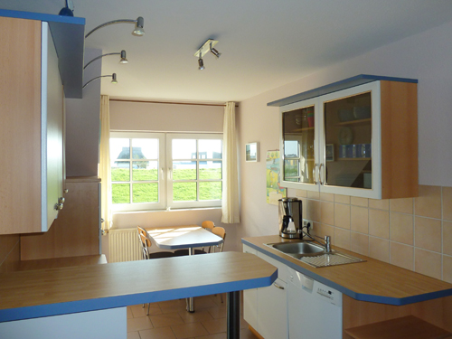 Die Wohnung ist 40m2 groß und befindet sich im 1. Obergeschoss des Hauses Am Deich 41 a. Vom Frühstückstisch aus können Sie die Ostsee sehen. Es gibt ein Schlafzimmer mit Doppelbett und ein Schlafsofa im Wohnzimmer. Es ist ausreichend Platz vorhanden für ein Babybett. In der Küche befindet sich ein Gefrierschrank.